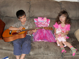 We celebrated our family Christmas the day before we left. The kids were excited to open their presents early. Here they are with some of their gifts. "K" received his first "real" guitar. Daddy will be giving him lessons. "A" is with her new baby she named "Ella".